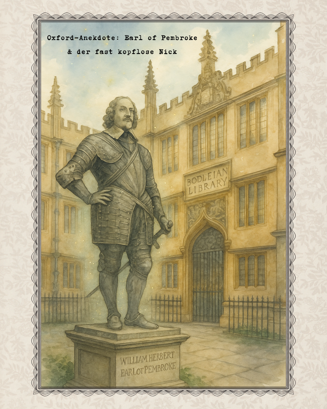 Vor einigen Jahren stand ich bei einer Stadtführung in Oxford vor der Statue von William Herbert, 3rd Earl of Pembroke (1580–1630) – sie thront direkt vor der ehrwürdigen Bodleian Library, einem Ort, der Geschichte atmet und an jeder Ecke Geschichten flüstert.
